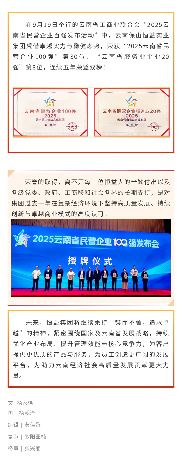 榮登雙榜!恒益集團(tuán)榮獲2025云南民企百強第30位、服務(wù)業(yè)20強第8位 來源: 瀏覽量:1843 日期:2025-09-19 分享到: 上一篇:恒益集團(tuán)開展高管刑事法律風(fēng)險防范與合規(guī)體系建設(shè)專項培訓(xùn) 下一篇:恒益集團(tuán)與省心說科技達(dá)成合作 共筑微信電商新生態(tài)